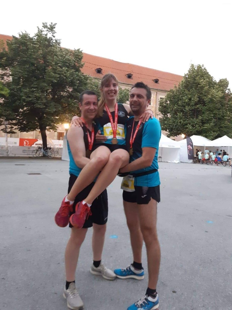 A Franjo, šta reć za njega, odličan iskusan trkač, i super prijatelj, uopće nije ljubomoran što više nije najbrži u grupi😁😜. Baš naprotiv, uvijek je spreman pomoći nekim korisnim savjetom, ipak je čovjek skupio već podosta utrka😊. Uglavnom, trčao je prvu izmjenu, bez ikakvih kalkulacija odmah krenuo jako, i u super tempu 3min 55sek po km istrčao svoj dio💪👏👏👏. Zadnju izmjenu trči moja malenkost, dajem sve od sebe, svoj dio trčim za 12min i 5 sek, ukupno vrijeme nam je bilo 41min i 2sek, dovoljno za drugo mjesto i još jedan pehar koji nosimo u Samobor! Petra i Franjo, bilo mi je zadovoljstvo trčati s vama 😁