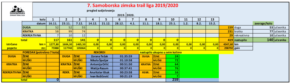 Do sada vas je barem u jednom kolu, od tri održana, na nekoj stazi, nastupilo 259 različitih, pri čemu je posjećenost iznimna. Prosjek prva tri kola je 140 sudionika po kolu, 53 na dugoj, 77 na kratkoj i 10 na rekereativnoj stazi. Već ste istrčali 4347 kilometara, a s obzirom da se radi o trailu, i ima dosta uspona, iako generalno manje nego prošle godine, popeli ste gotovo 34 visine najvišeg vrha na svijetu. Tko voli detalje, trenutna tablica, sa rekorderima staza je ono šareno što ste preskočili prije čitanja ovih redova. By the way, jučer su pala dva rekorda, no o tome u sljedećih paragrafima.